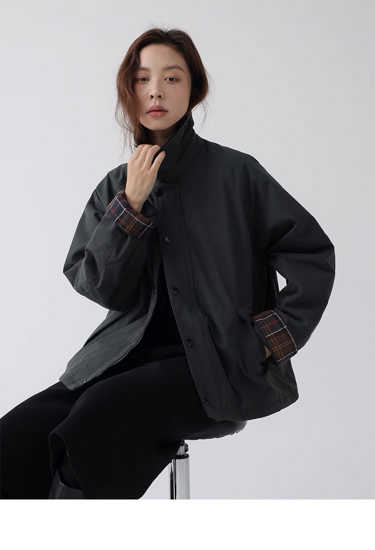 Barnfit 燈芯絨領格紋拼接多口袋鋪棉夾克