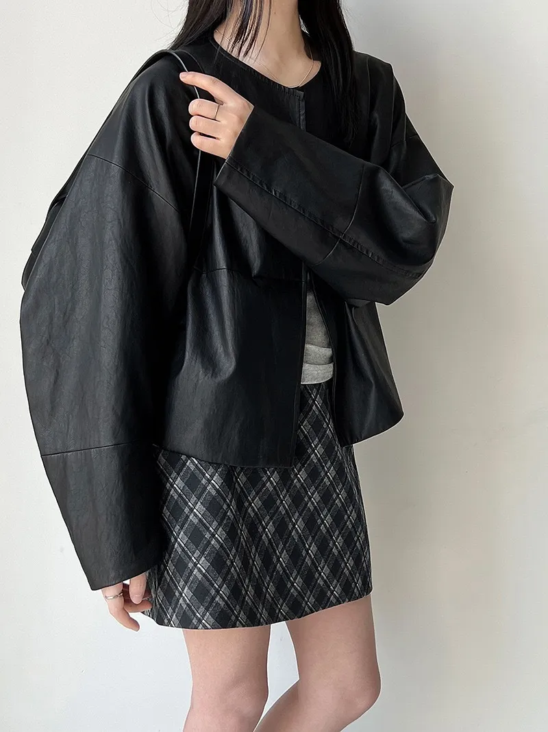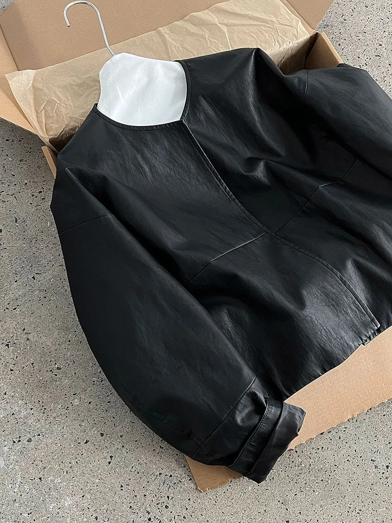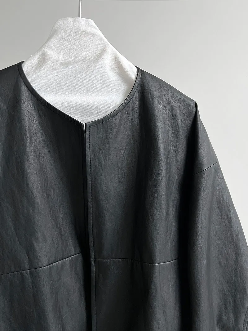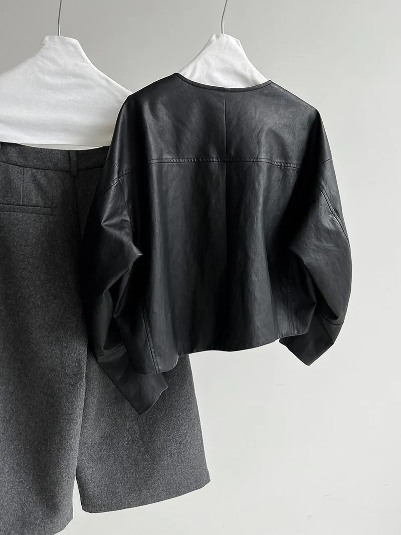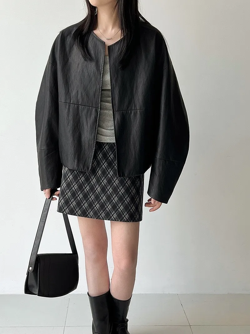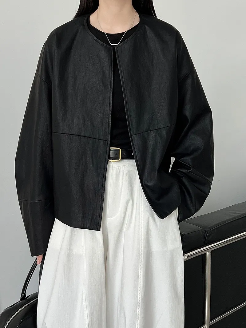 極簡彎刀袖型輕薄無領皮衣