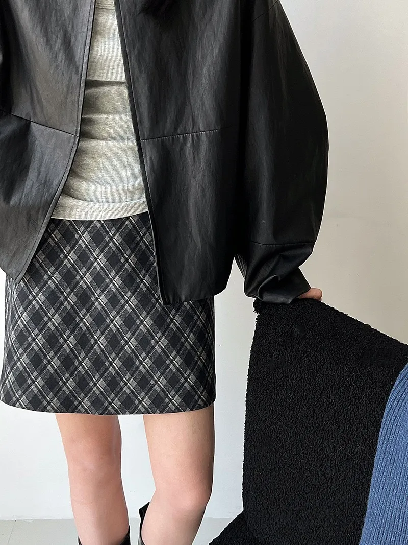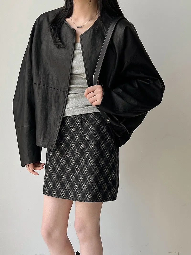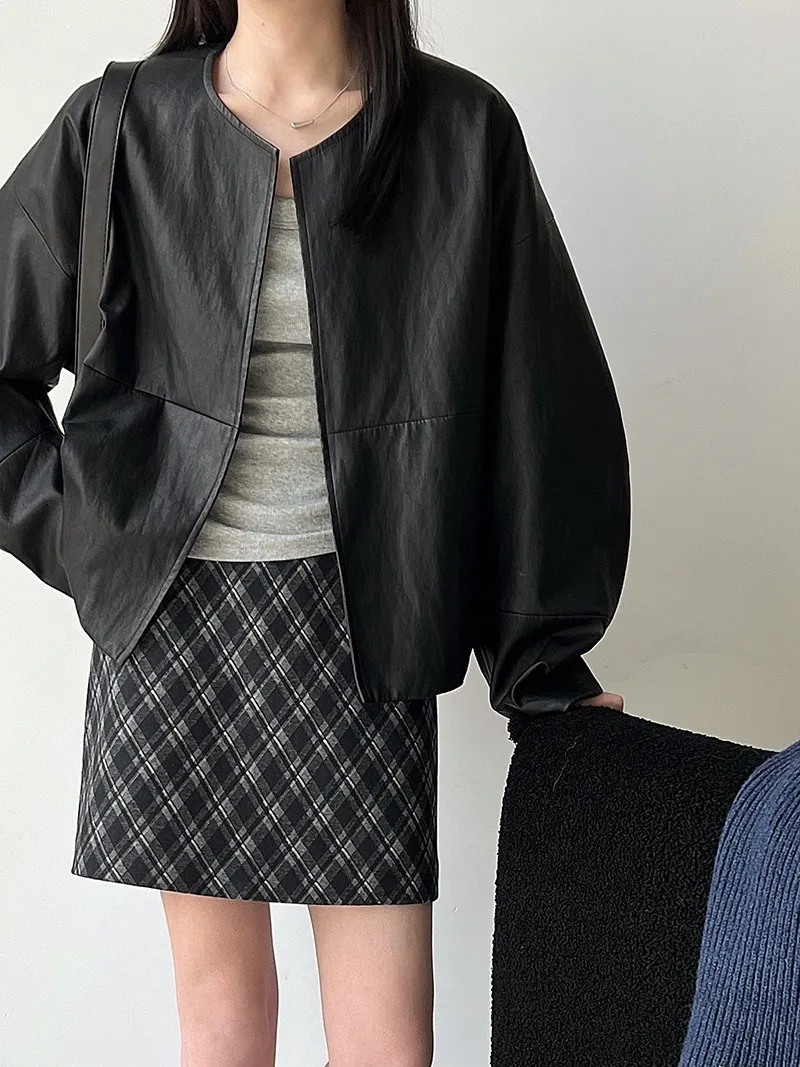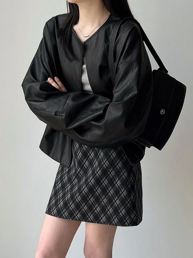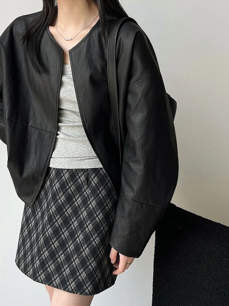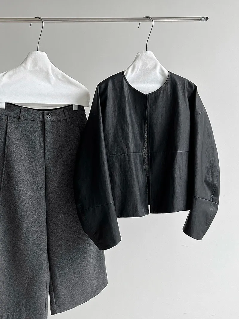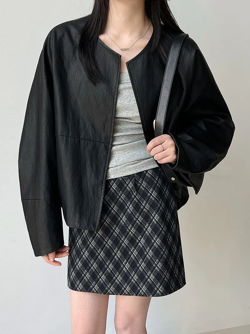 極簡彎刀袖型輕薄無領皮衣